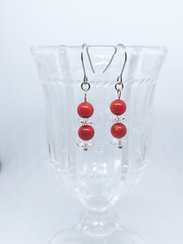 小さな赤珊瑚のフックピアスになります 健康と活力の向上、幸福、長寿などの意味を持つ赤珊瑚 とても綺麗な赤色です。 6mm玉と小さいながらも存在感がありカットされた水晶がキラキラと輝き耳元を彩ります。 フックにはアレルギー反応の出にくいステンレスを使用しております。(全ての方にアレルギー反応がでにくいわけではありません) 樹脂製フックもご用意しておりますのでカートよりお選びください 赤珊瑚6mm玉 水晶2mm 全長4cm